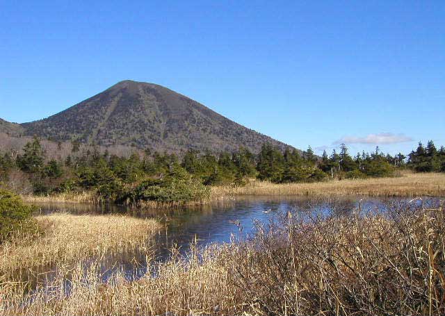 バス通り脇の睡蓮沼、観光バスも止まって、小休止する名所です。この写真のみは2001.11の撮影です。この時はもう道の脇には雪が見られました。冬で通行止めになる寸前でした。背景は高田大岳1552メートルです。