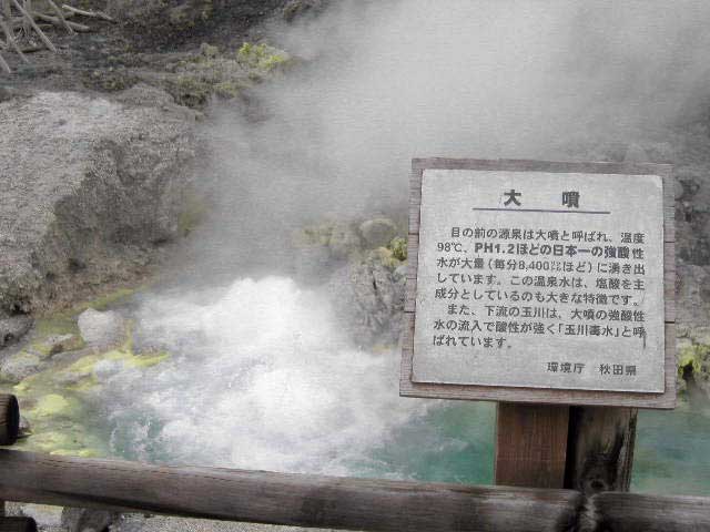 大噴、この看板にあるように毎分8400リットルの高温98度で塩酸並みのPH1.2のお湯がこの噴出口から噴出しています。強酸性で金属はすぐ腐食してしまいます。
