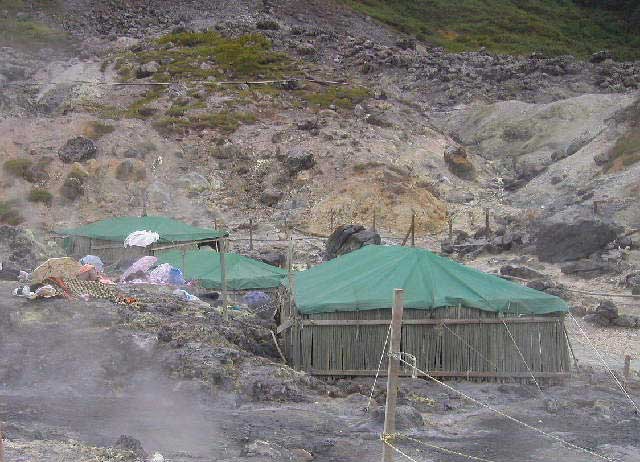 噴気孔の中にある岩盤浴のテント小屋と露天風呂、小屋の中はすでに満員で、周辺の地面や岩盤の上の随所にも沢山の人が岩盤浴をしています。手前は露天風呂です。脱衣の棚はありますが、周囲を覆う囲いはありません。